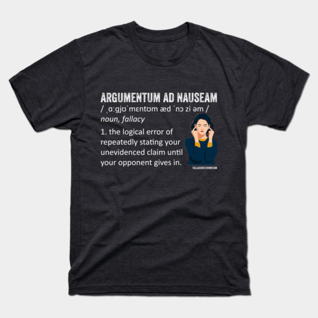 The Ad Nauseam logical fallacy refers to a situation where someone asserts a claim repeatedly, often even after the claim has been debunked, in the hope that people will start to believe it through sheer repetition and that people will get sick of trying to refute it so they will simply give up.
