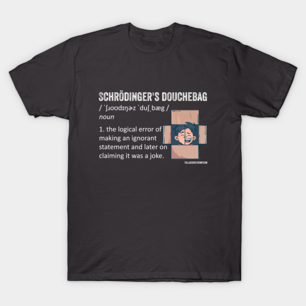 Jim: Well, yeah, because, I mean, I think it’s not very dissimilar to how moving the goalposts, for example, is used and various other rhetorical devices. And essentially, what Schrödinger’s Douchebag is, is when someone says a thing, either makes a claim or an argument, or makes a statement, which is ignorant, bigoted, or just plain wrong, and then when they’re criticized for it or called out on it, they will claim that they were just joking, that they weren’t serious when they said it. And so, obviously, where the Schrödinger thing comes in is that the statement is simultaneously serious and jokey until someone says, that’s not cool, man. Don’t say that. And then it becomes a joke, one or the other.