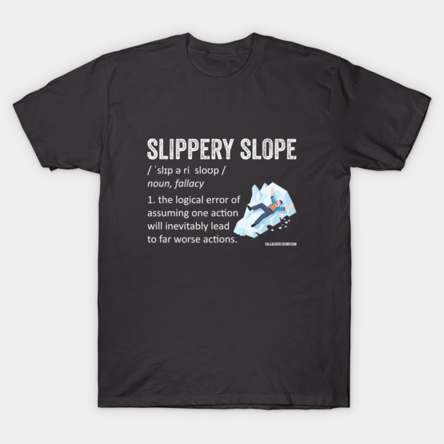 The Slippery Slope fallacy is committed when a person assumes if one bad thing happens, then more, and often worse, bad things will inevitably follow. It is often applied to changes in the law that some groups are campaigning for, and others find distasteful.
