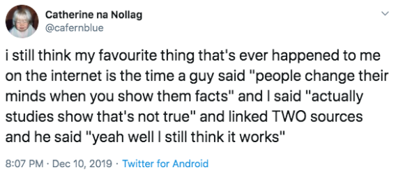 i still think my favourite thing that’s ever happened to me on the internet is the time a guy said “people change their minds when you show them facts” and I said “actually studies show that’s not true” and linked TWO sources and he said “yeah well I still think it works”